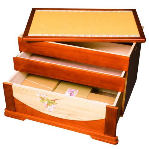多彩な色糸であしらった豪華な花柄の本刺繍をたっぷり施した親王様と優雅な雰囲気を醸し出す桜蒔絵入りの屏風に、「日本三大人工美林」のひとつとして名高い静岡の天竜杉を使用した収納箱をセットした豪華な衣裳着五人三段引き出し式収納飾りです。