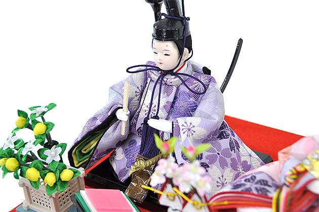 主役である可愛いお顔のお雛様の衣装には、縁起の良い吉祥桜柄模様が入ったおめでたい正絹地を取り入れた共柄衣装で着付けました。 お殿様の衣装は派手さはなく衣装全体に大きな桜柄模様が見える高貴な薄紫衣装に。 しっかり前を見つめ、右手に手尺を持ち、左脇差には大きく長めの刀を携え、堂々とした佇まいがとても凛々しいお殿様です。
