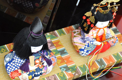 お姫様には、赤やピンクや金色の友禅地に桜・もみじ・菖蒲とさまざまな花をカラフルに描いた衣裳着と鮮やかな赤の袴を木目込みました。頭には鶴の飾りのついた華やかな冠を付けた豪華かつ可愛らしいお姫様です。