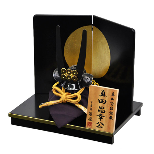 その真田昌幸公の兜を彦根城博物館蔵の甲冑より模写し今に伝える素晴らしいデザインを美しくセットしたコンパクトなお飾りです。 天を指す天衝に真田の印である六文銭を頂いた前立は見るものを圧倒させます。 シックなブロンズの兜の鉢に取りいれた筋鉢は、半円の型に幾つもの筋を入れたような様式です。 本物の形にこだわり、耳のような部分の吹き返しの形状もより忠実で、なおかつ優雅な線を表現しています。 伊予札仕立ての錣(しころ:兜の後ろの段々の部分)は山吹色の紐にて編み込んだ山吹縅としました。
